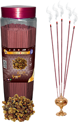 Agarbatti with pleasant fragrance of Guggal. Net weight of one jar is 300 grams.