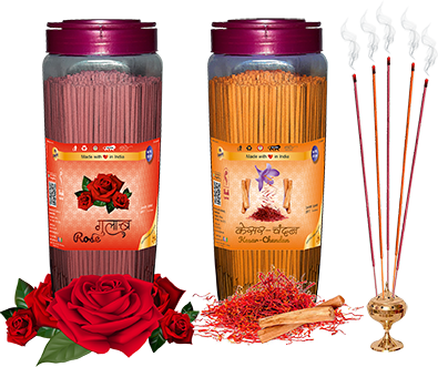 Agarbatti with pleasant fragrances of Rose & Kesar Chandan. Net weight of one jar is 500 grams.