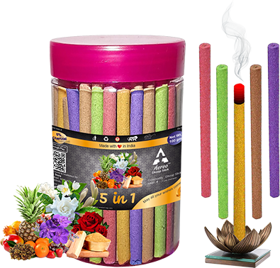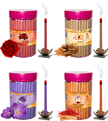 Dhoop Sticks with pleasant fragrances of Rose, Mogra, Panchvati, Lavender & Pineapple. Net weight of one jar is 100 grams.