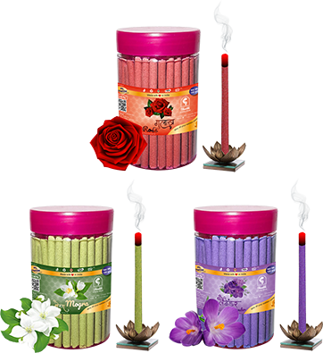 Dhoop Sticks with pleasant fragrances of Rose, Mogra & Lavender. Net weight of one jar is 100 grams.