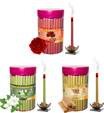 Dhoop Sticks with pleasant fragrances of Rose, Mogra & Sandal. Net weight of one jar is 100 grams.